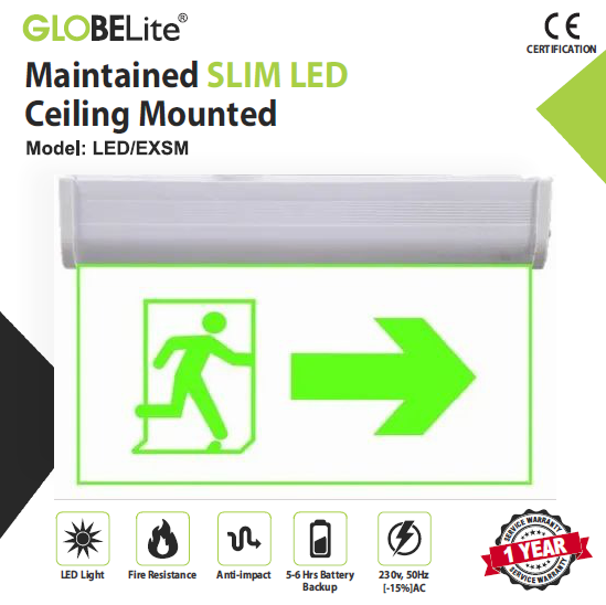 Introducing the GLOBELite® Sleek LED SM – “RMA” (Running Man Arrow), a modern and highly reliable emergency exit light designed to provide clear evacuation direction during power failures and emergency situations. Featuring the international running man symbol with a right arrow indicator, this sign helps occupants quickly identify the correct exit path in low visibility conditions. Built with a durable aluminium profile body and sleek finish, it delivers consistent maintained illumination with long-lasting battery backup for uninterrupted safety support. Perfect for offices, malls, hospitals, hotels, schools, and industrial facilities, the GLOBELite® RMA Exit Light ensures dependable performance, improved emergency guidance, and peace of mind when it matters most.
